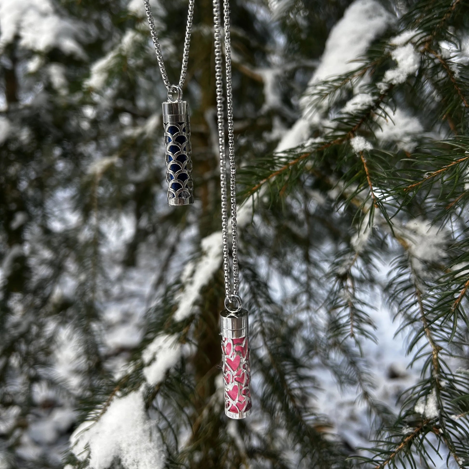 Die Kette ist aus Edelstahl und hat zwei verschiedenen Designs. Zudem werden verschiedene Farben an festen Watteeinsätzen mitgeliefert. Wenn sie aufgebraucht sind, kannst du normale Watte nehmen.